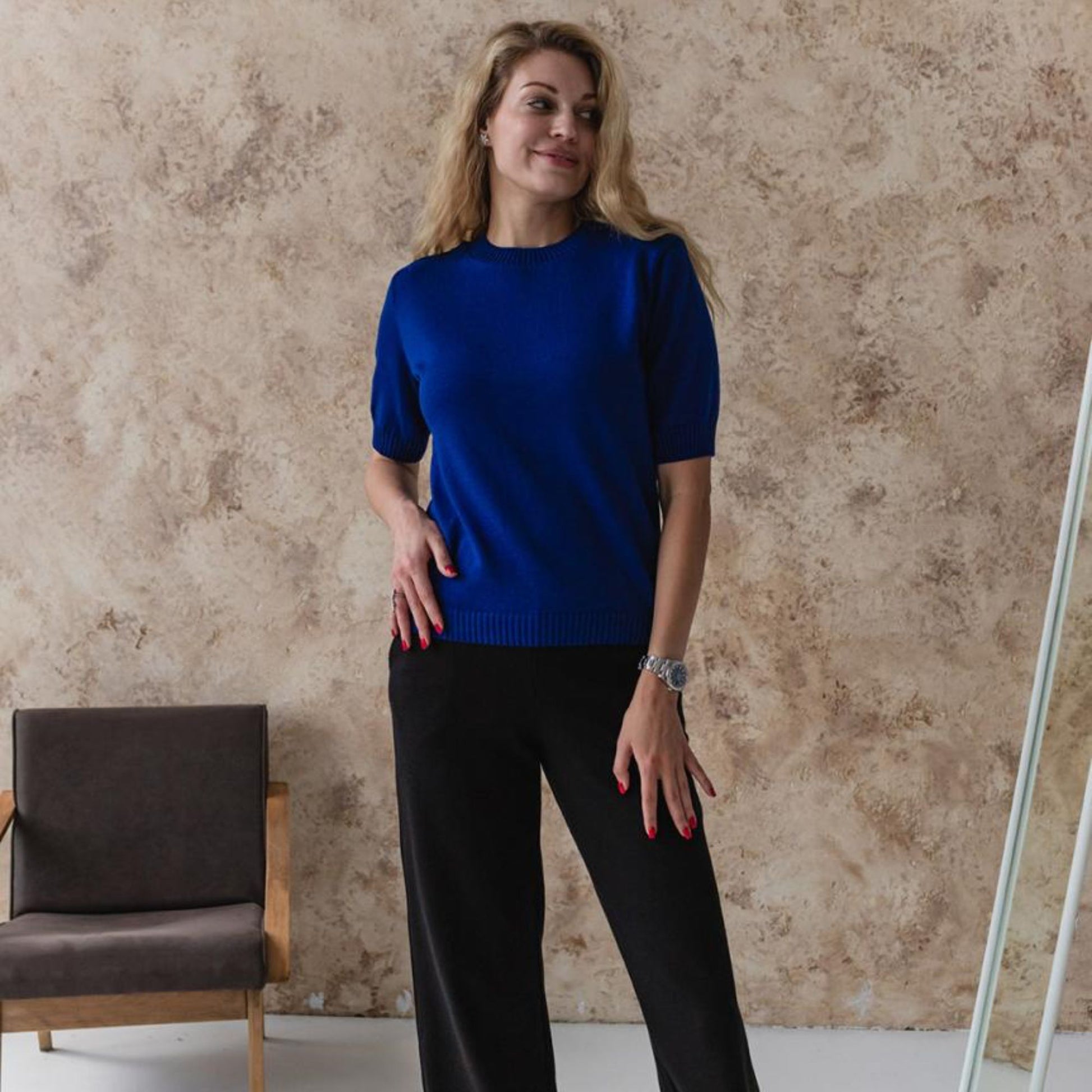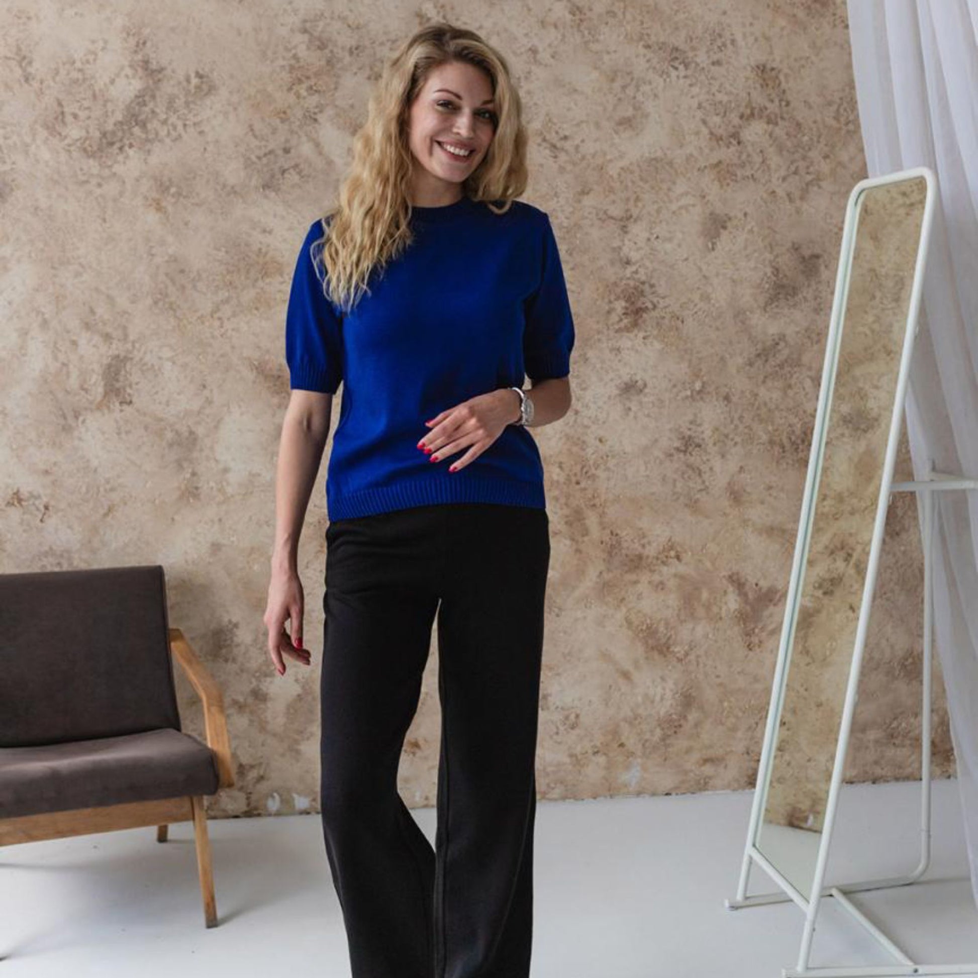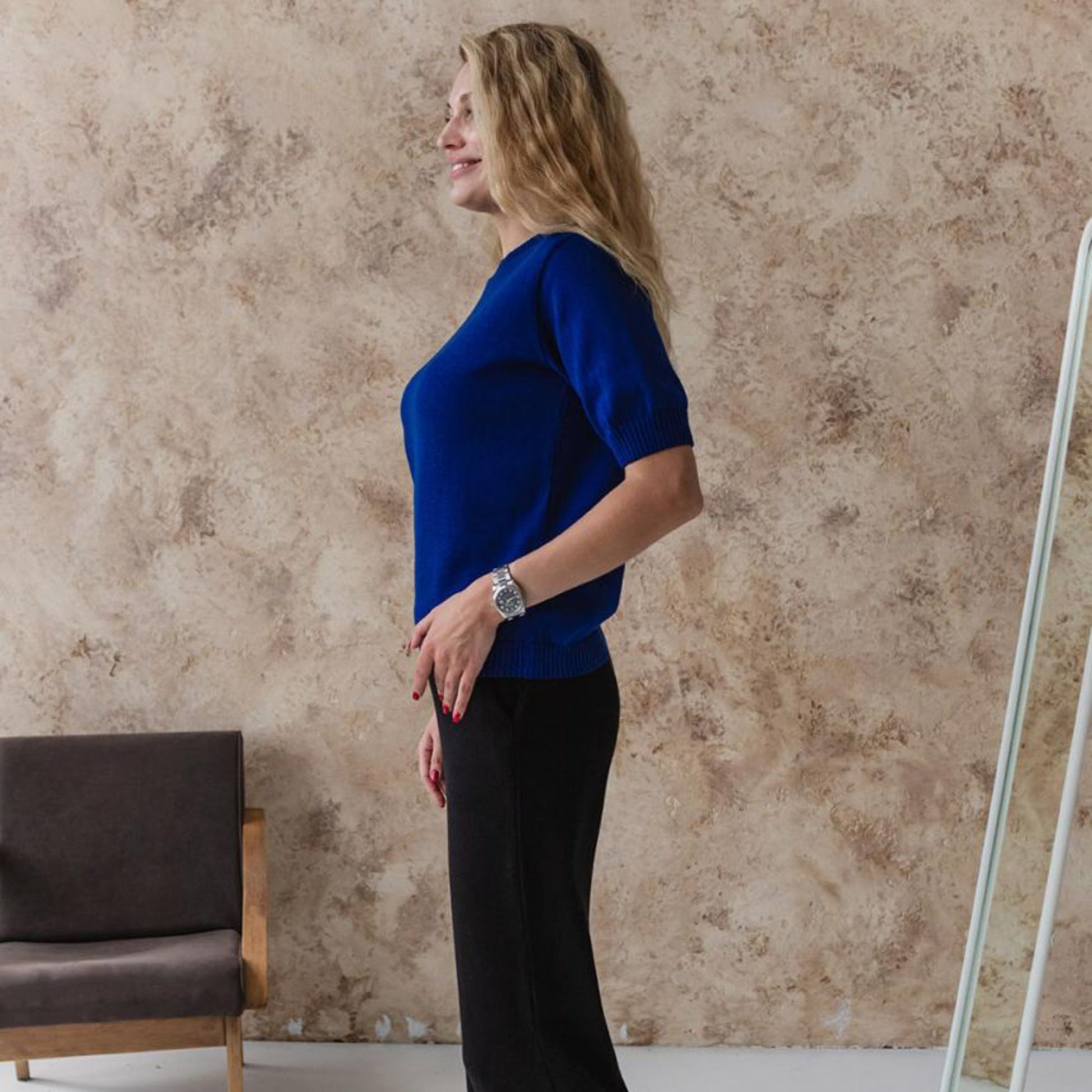 The blue knitted T-shirt is a fresh and versatile wardrobe piece, crafted from a soft cotton blend (50% cotton, 50% acrylic). Lightweight, breathable, and skin-friendly, it feels pleasant to wear all day and is perfect for warm weather. Its minimalist short-sleeve design pairs effortlessly with jeans, skirts, or trousers, making it easy to style for both casual and chic outfits.