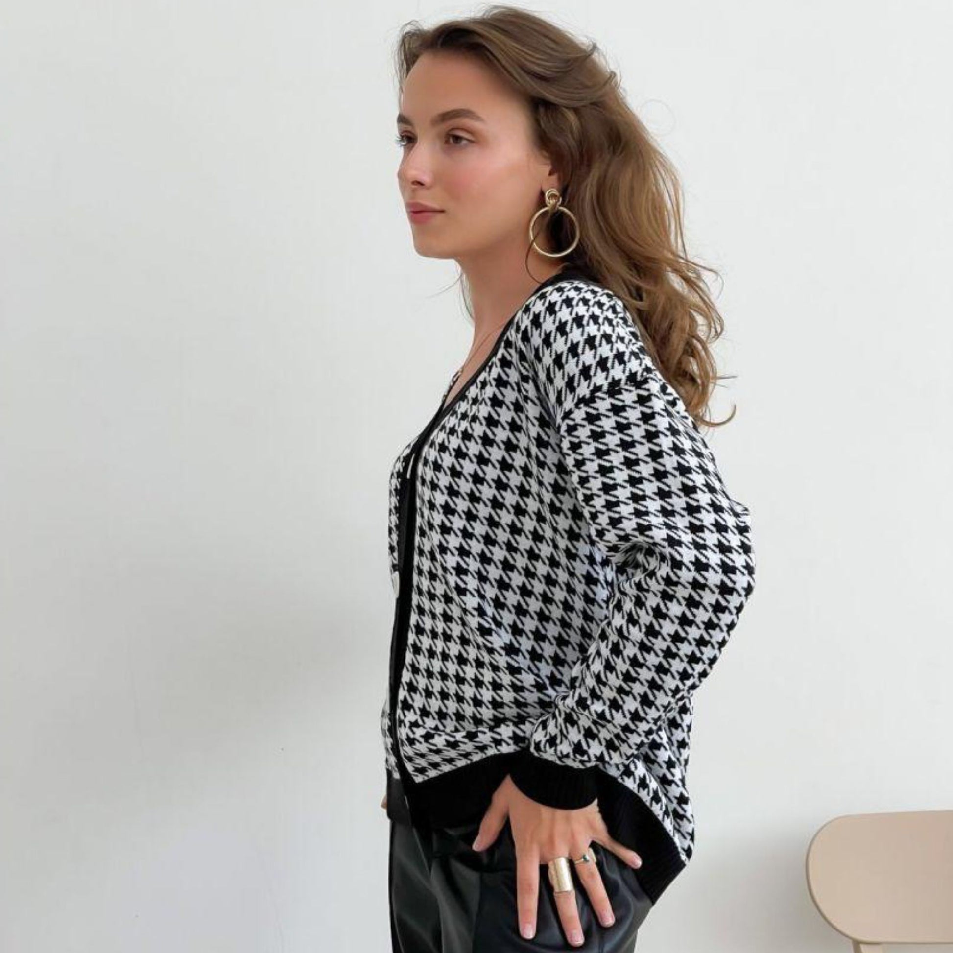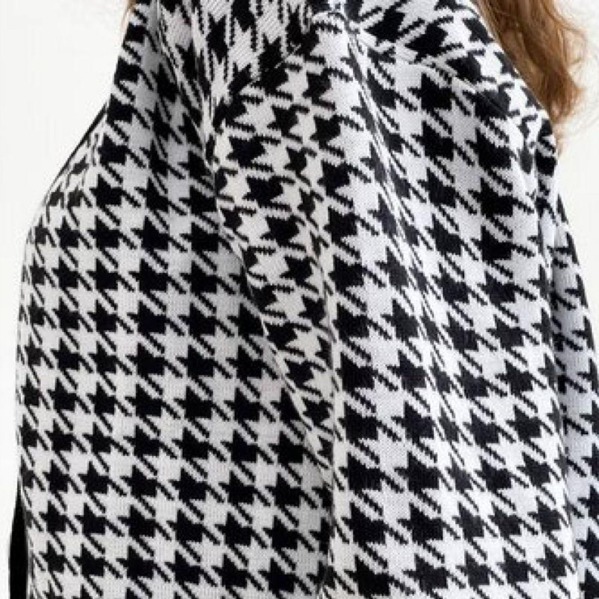 Designed with a relaxed oversized fit, medium length, and button-up front, this cardigan adds a touch of sophistication to both casual and dressy outfits. Its timeless black-and-white pattern creates a modern yet elegant appeal - ideal for spring, autumn, or cool winter days.