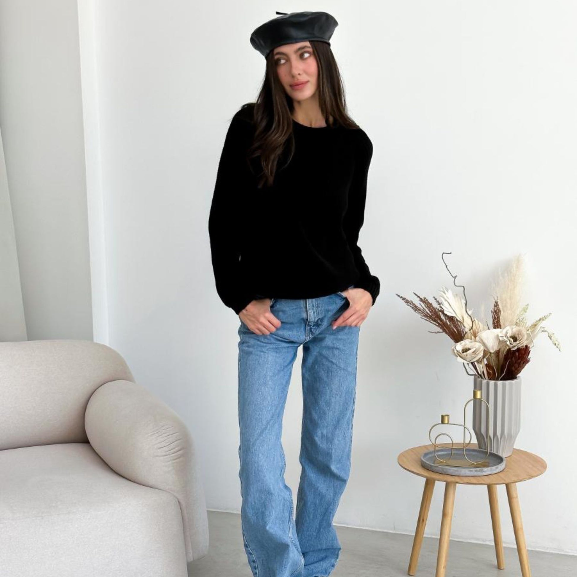 This classic black knitted sweater is crafted from a breathable and soft fabric blend, making it both comfortable and versatile. With its minimalist design and long sleeves, this sweater is perfect for layering in colder seasons or wearing on its own for a cozy everyday look.
