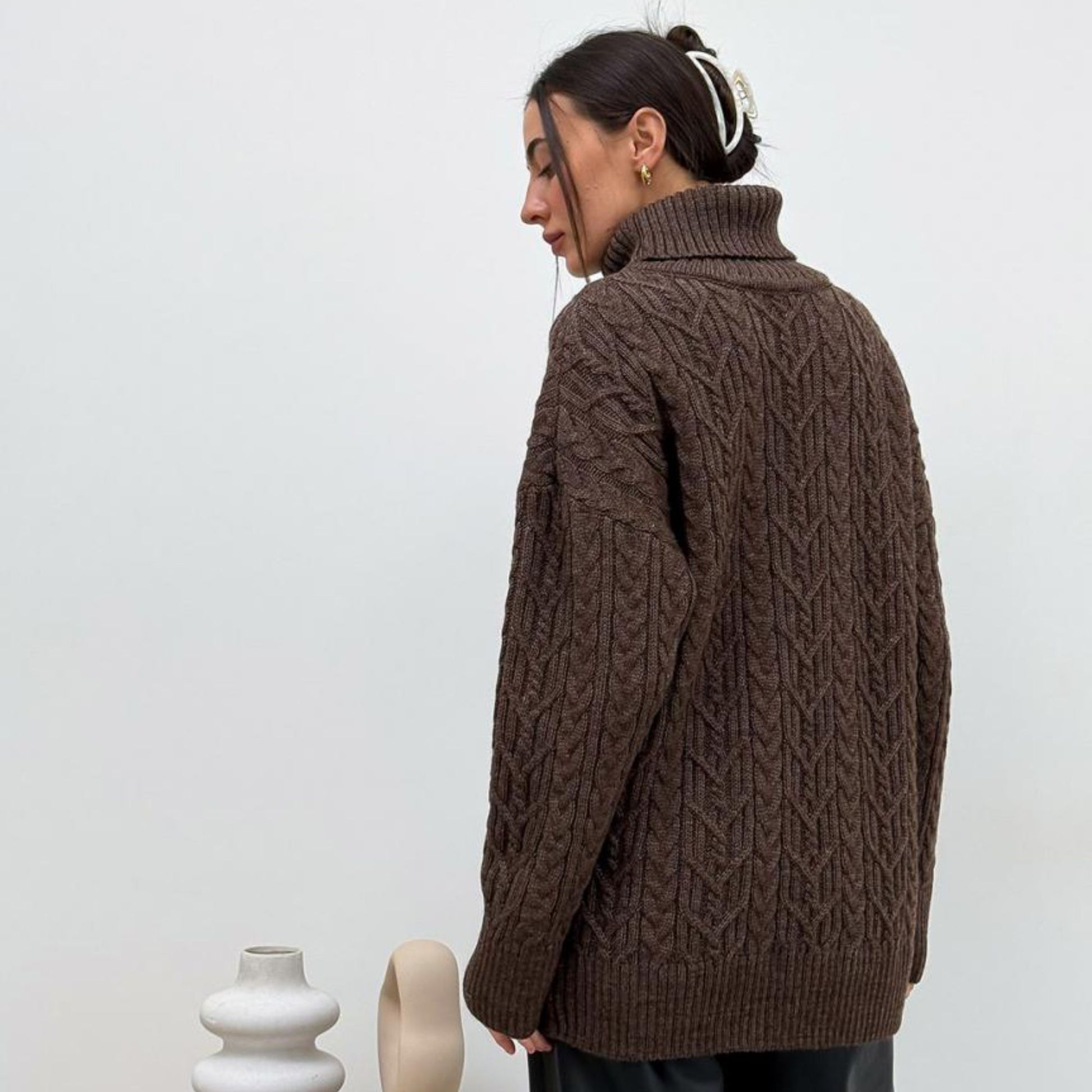 The brown knitted sweater Olivia blends comfort, elegance, and practicality. Made from a cozy wool blend (30% wool, 70% acrylic), it features a textured knit with a soft neckline that feels pleasant against the skin. Its oversized fit makes it perfect for layering and styling with both casual and more polished looks.