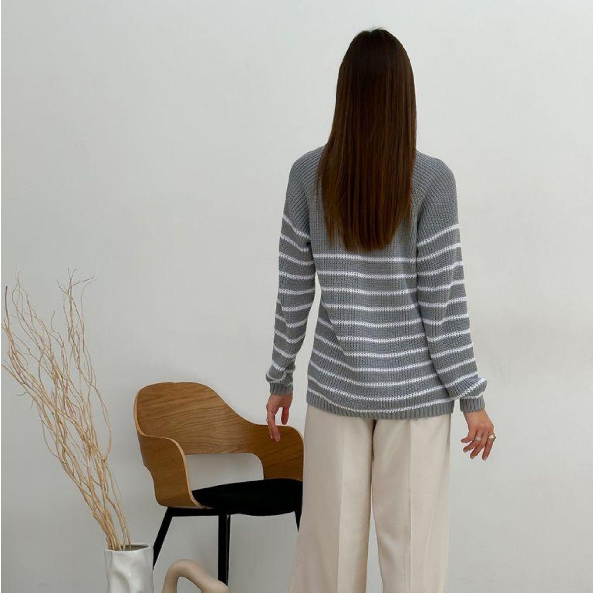 The grey striped knitted sweater is a versatile wardrobe essential, combining comfort and classic style. Made from a breathable cotton blend, it feels soft, lightweight, and gentle on the skin. With a minimalist design and long sleeves, this sweater is perfect for layering during cooler months or wearing on its own for a clean, stylish look.