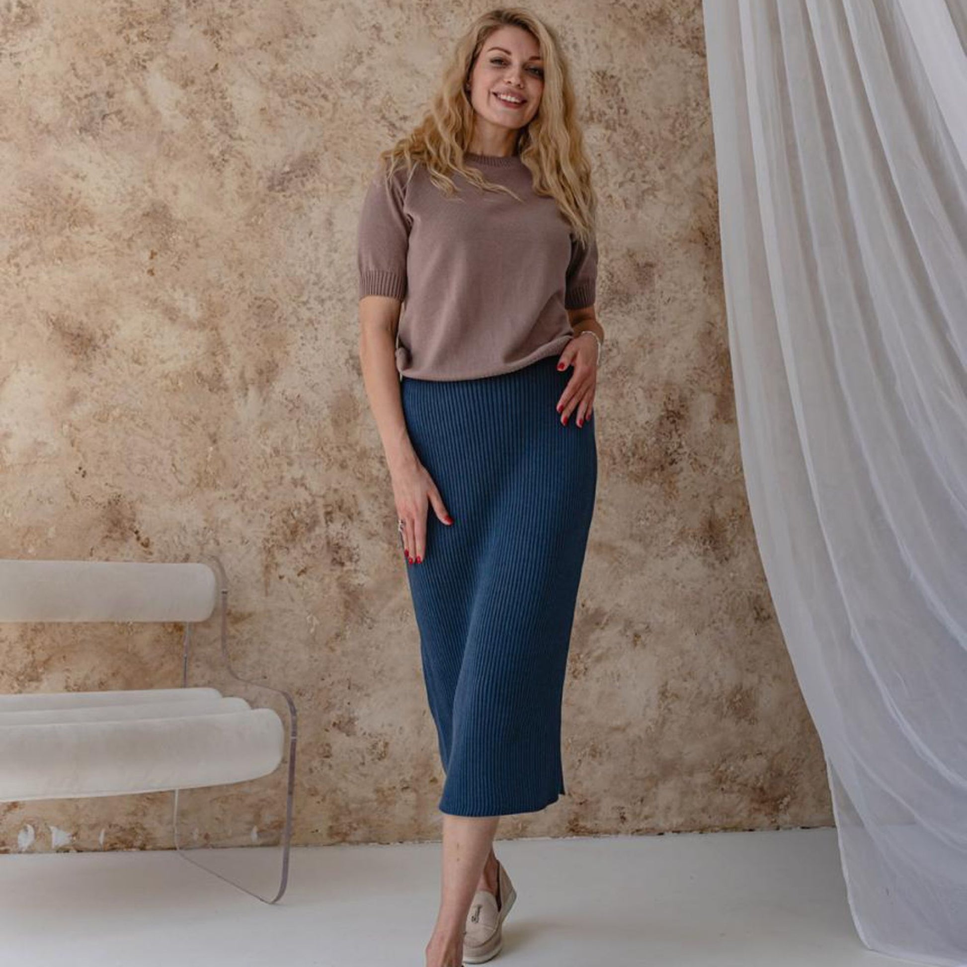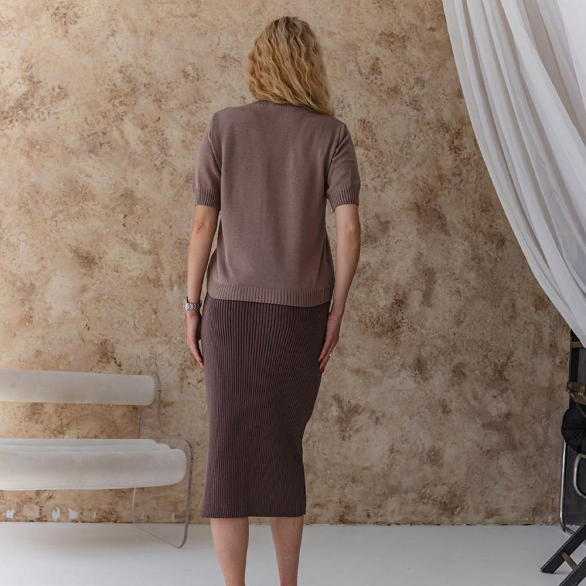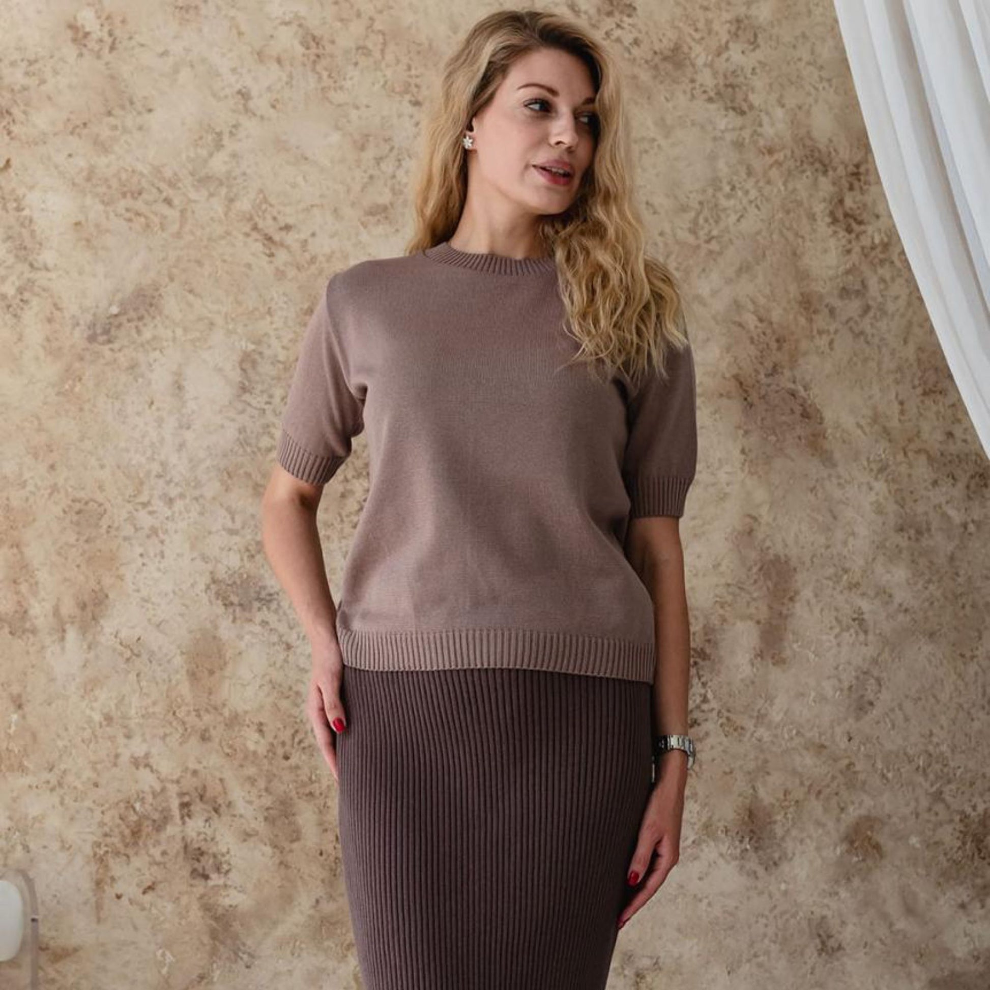 The taupe knitted T-shirt is a timeless and versatile piece, crafted from a soft cotton blend (50% cotton, 50% acrylic). Lightweight, breathable, and skin-friendly, it feels pleasant to wear all day long and makes the perfect choice for warm weather. Its minimalist short-sleeve design pairs effortlessly with jeans, skirts, or trousers, making it easy to style for both casual and chic outfits.
