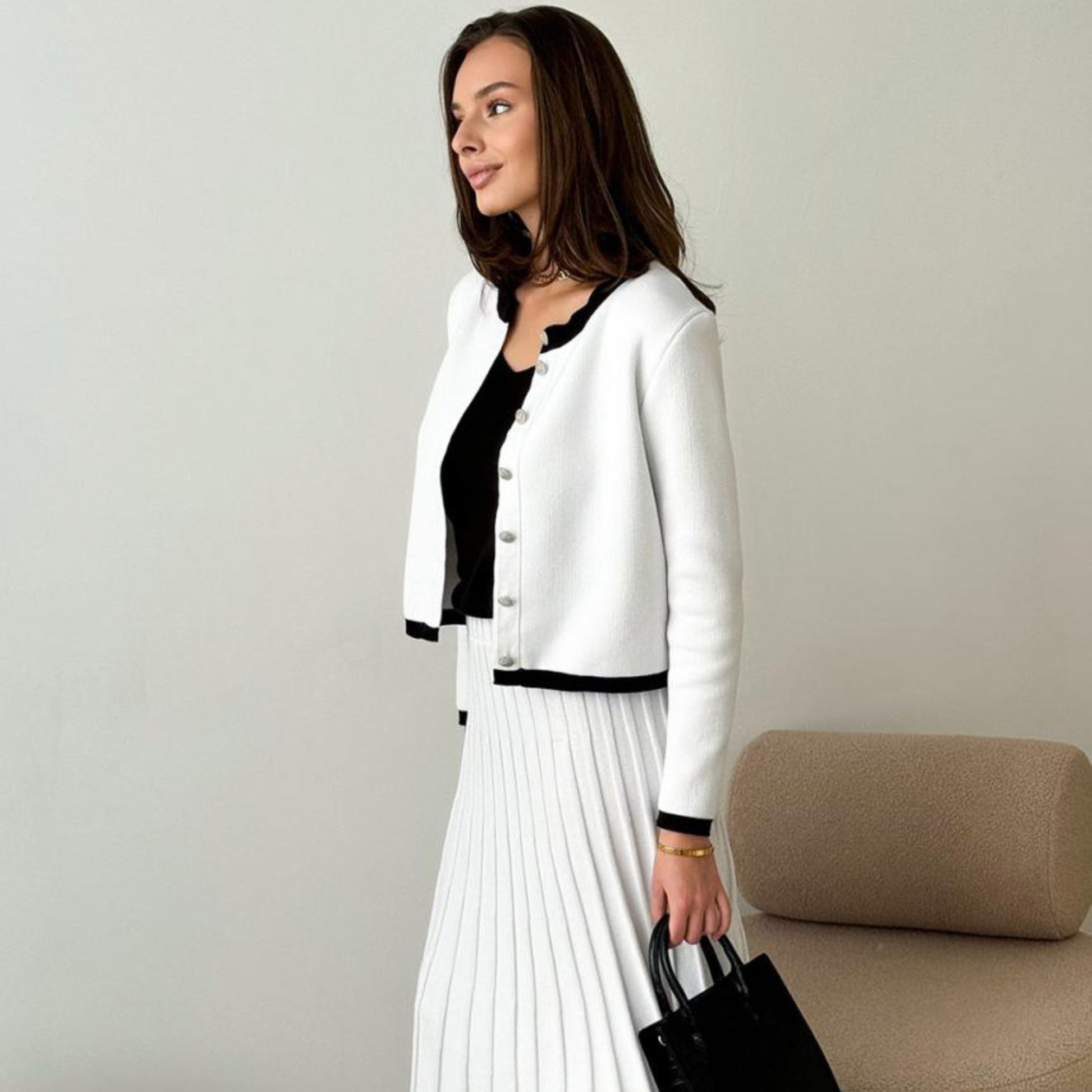 Designed with a straight cut and refined knit texture, it creates a flattering silhouette suitable for both casual and dressy occasions. The button-up closure adds a classic finish, making it a versatile layering piece that complements any look - from jeans and trousers to skirts and dresses.