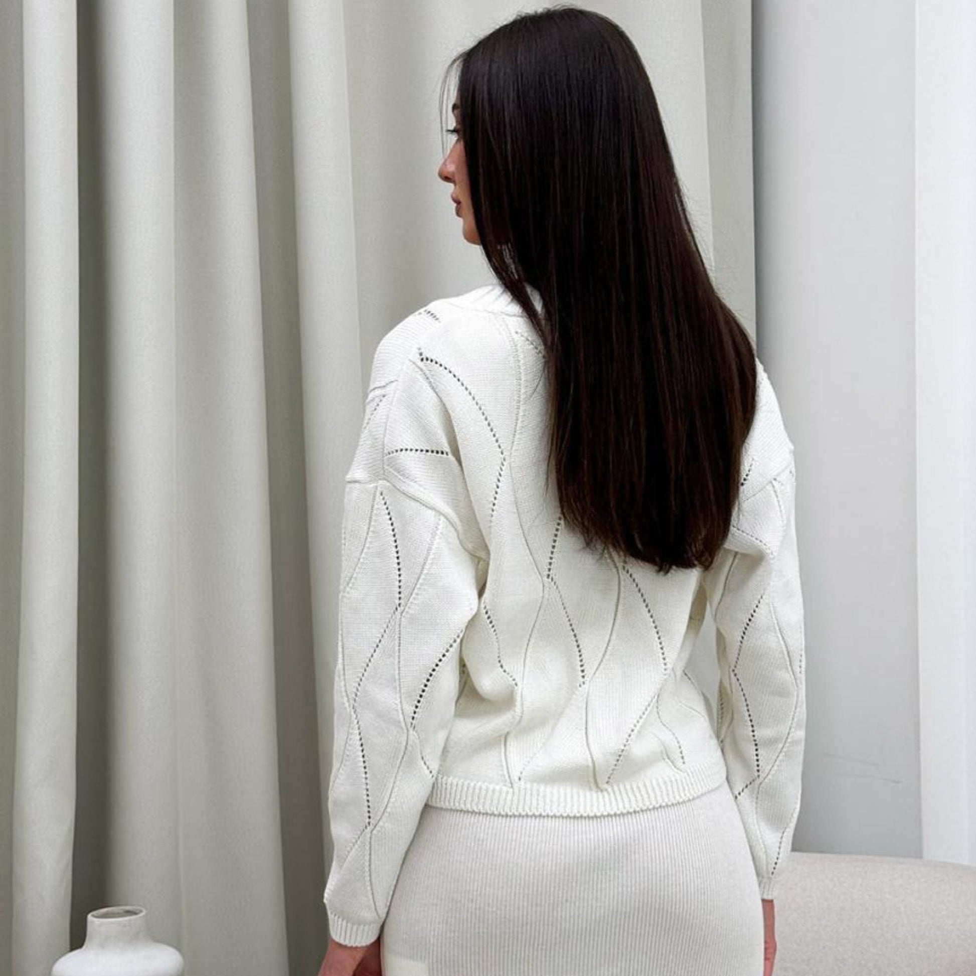 Elevate your wardrobe with the elegant Grace openwork knit cardigan in a soft white shade. Handmade from a high-quality cotton blend (50% cotton, 50% acrylic), this short cardigan combines lightness, comfort, and sophistication - perfect for layering during spring, summer, or early autumn.