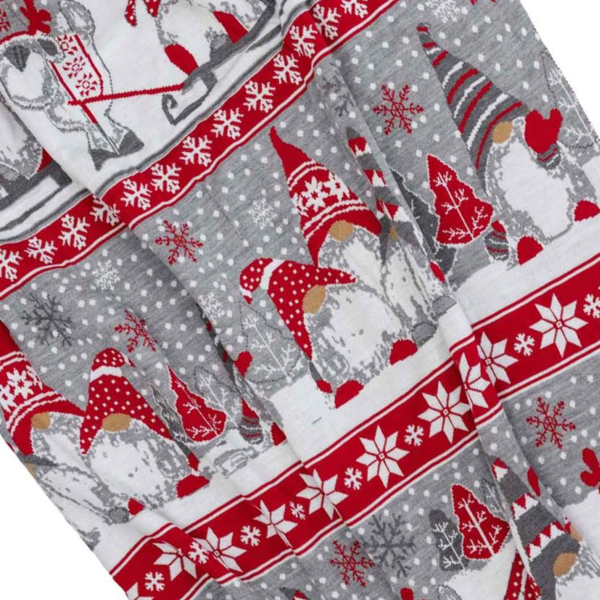Bring holiday cheer to your home with the Cheerful Gnomes knitted Christmas blanket in grey, white, and red. Made from 100% soft acrylic, this cozy throw is perfect for snuggling and adds festive charm to any room. Available in 35 × 51 inches and 51 × 67 in, this durable blanket is ideal for decorating your living space or gifting for Christmas.