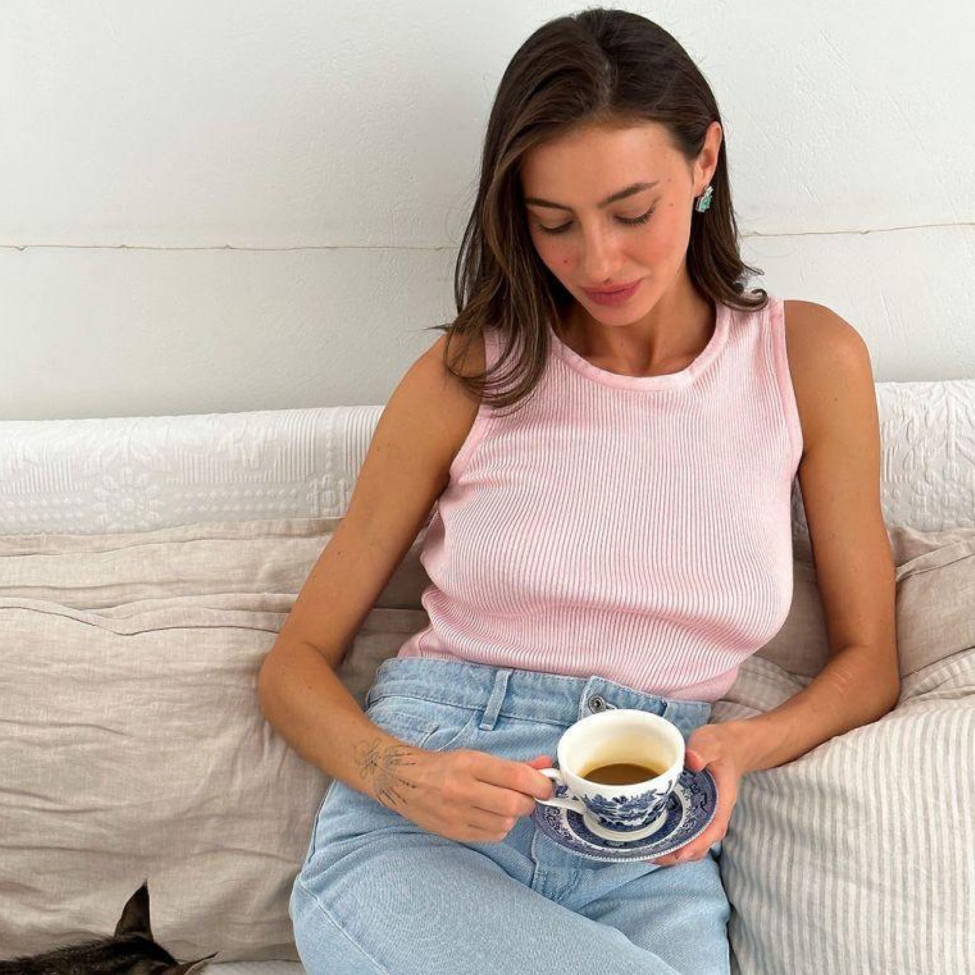 This soft and elegant light pink knitted tank top is made from a high-quality blend of 50% viscose and 50% acrylic, giving it a gentle and comfortable feel against the skin. Its minimalist design makes it versatile for casual or layered outfits.