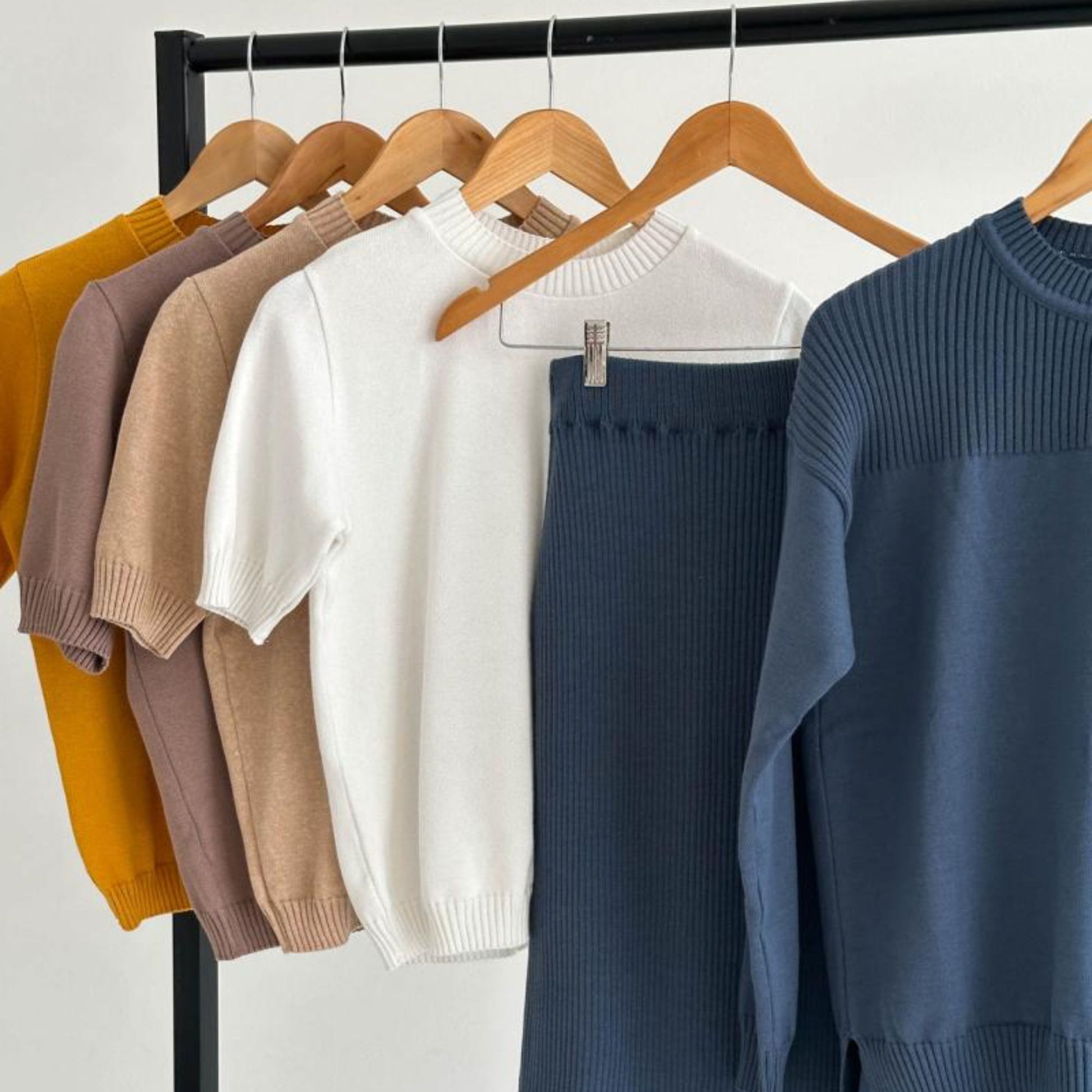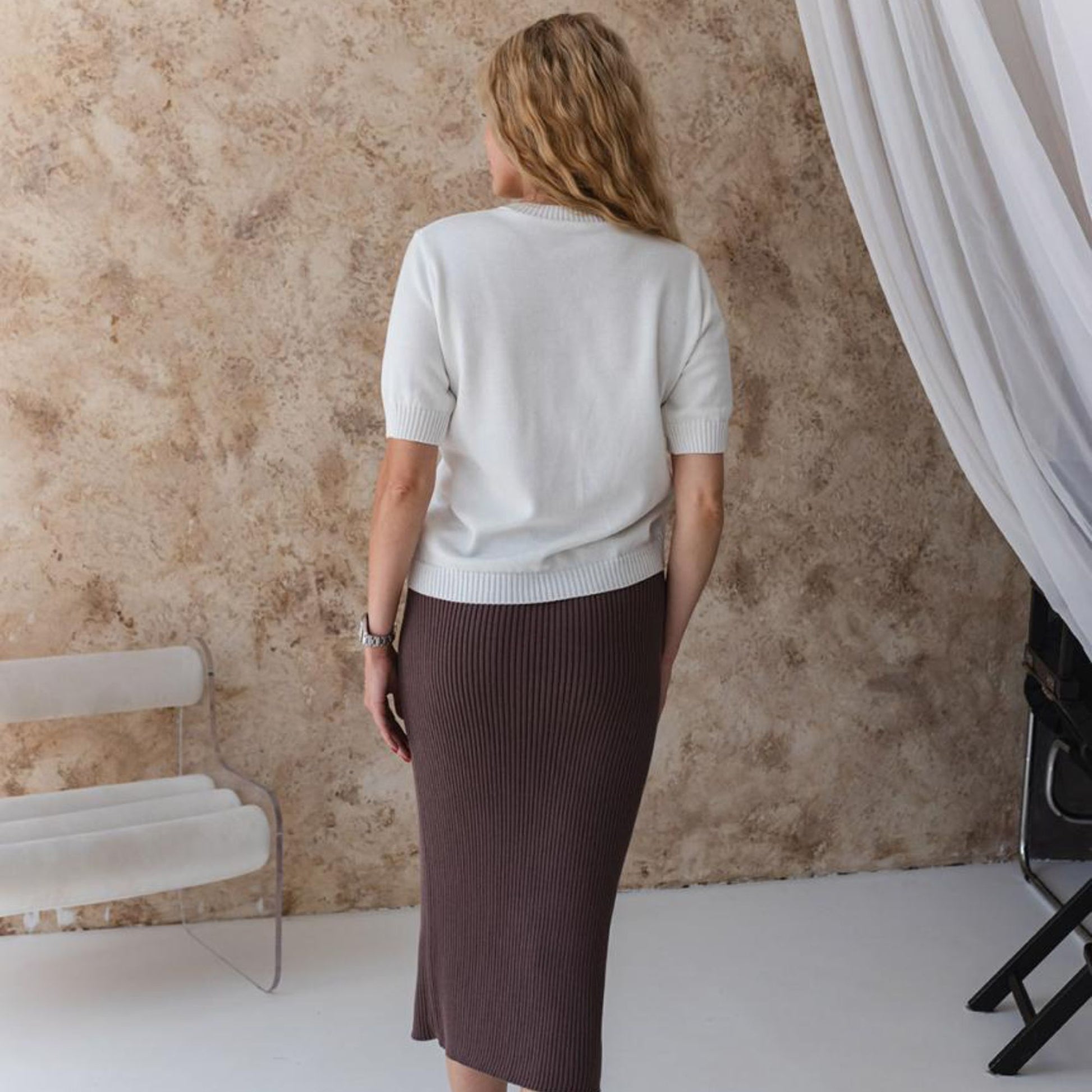 The white knitted T-shirt is a fresh and elegant addition to your summer wardrobe. Crafted from a breathable cotton blend (50% cotton, 50% acrylic), it is lightweight, skin-friendly, and comfortable for all-day wear. Its clean short-sleeve design makes it easy to combine with skirts, jeans, or tailored pants for both casual and dressy looks.